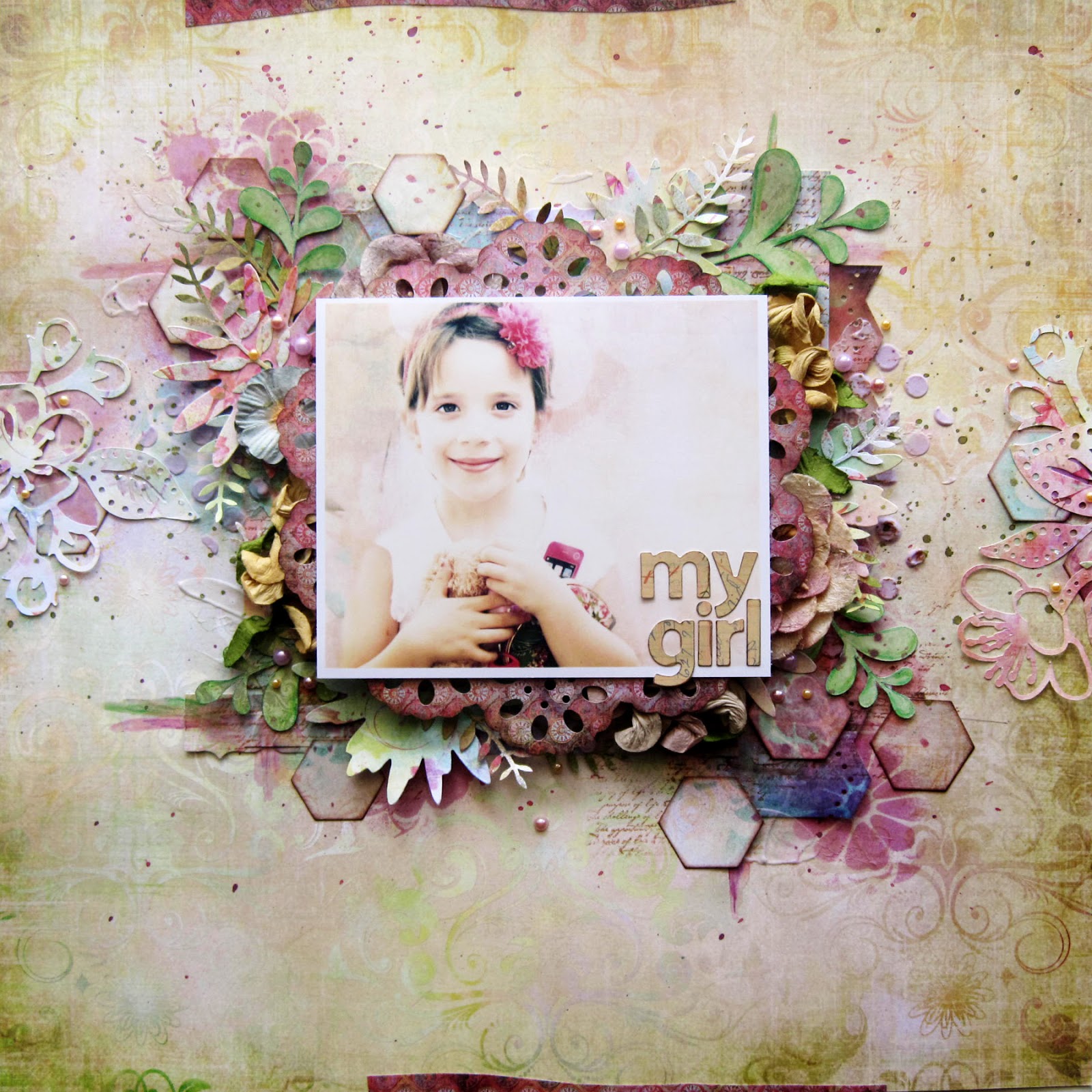 This is a little different for me (no white cardstock), but I wanted the layout to be soft to suit the photo. The photo itself, I cut the background out from around my daughter in Photoshop, and used a soft paper and a bokeh effect from Anna Aspnes in its place. I haven't done any journaling on the page as I also used this photo on my digital Project Life project:
